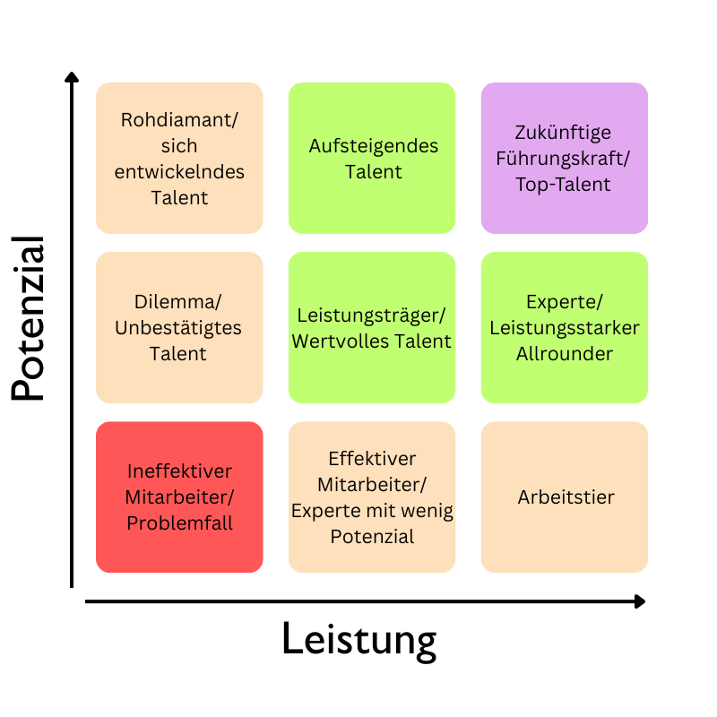 Das am weitesten verbreitete Instrument ist die 9-Box-Matrix. Hierbei werden Mitarbeitende in einem Koordinatensystem eingeordnet, dessen Achsen die aktuelle Leistung (Performance) und das zukünftige Potenzial darstellen.