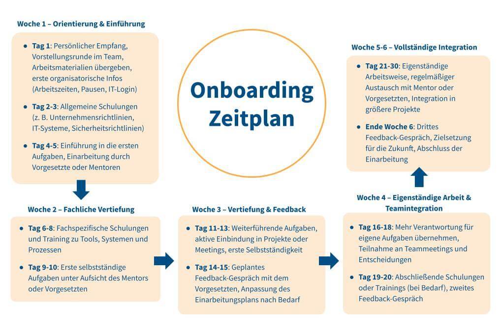 Der Einarbeitungsplan ist das Herzstück des Onboarding-Prozesses. Ein gut strukturierter Plan legt fest, welche Schulungen, Meetings und Aufgaben in den ersten Tagen und Wochen auf den neuen Mitarbeiter zukommen. Dieser Plan sollte nicht zu überladen sein, um den neuen Mitarbeiter nicht zu überfordern, aber auch nicht zu vage, damit er sich nicht unterbeschäftigt fühlt.