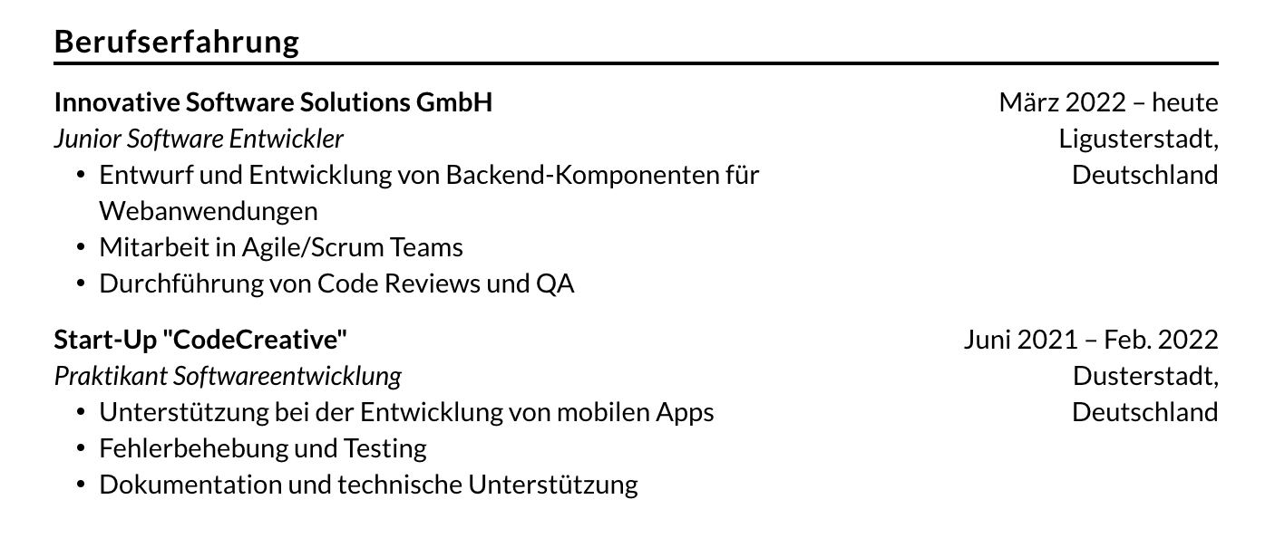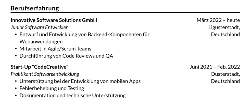 So könnte der Abschnitt „Berufserfahrung“ in einem tabellarischen Lebenslauf eines Junior Softwareentwicklers aussehen: