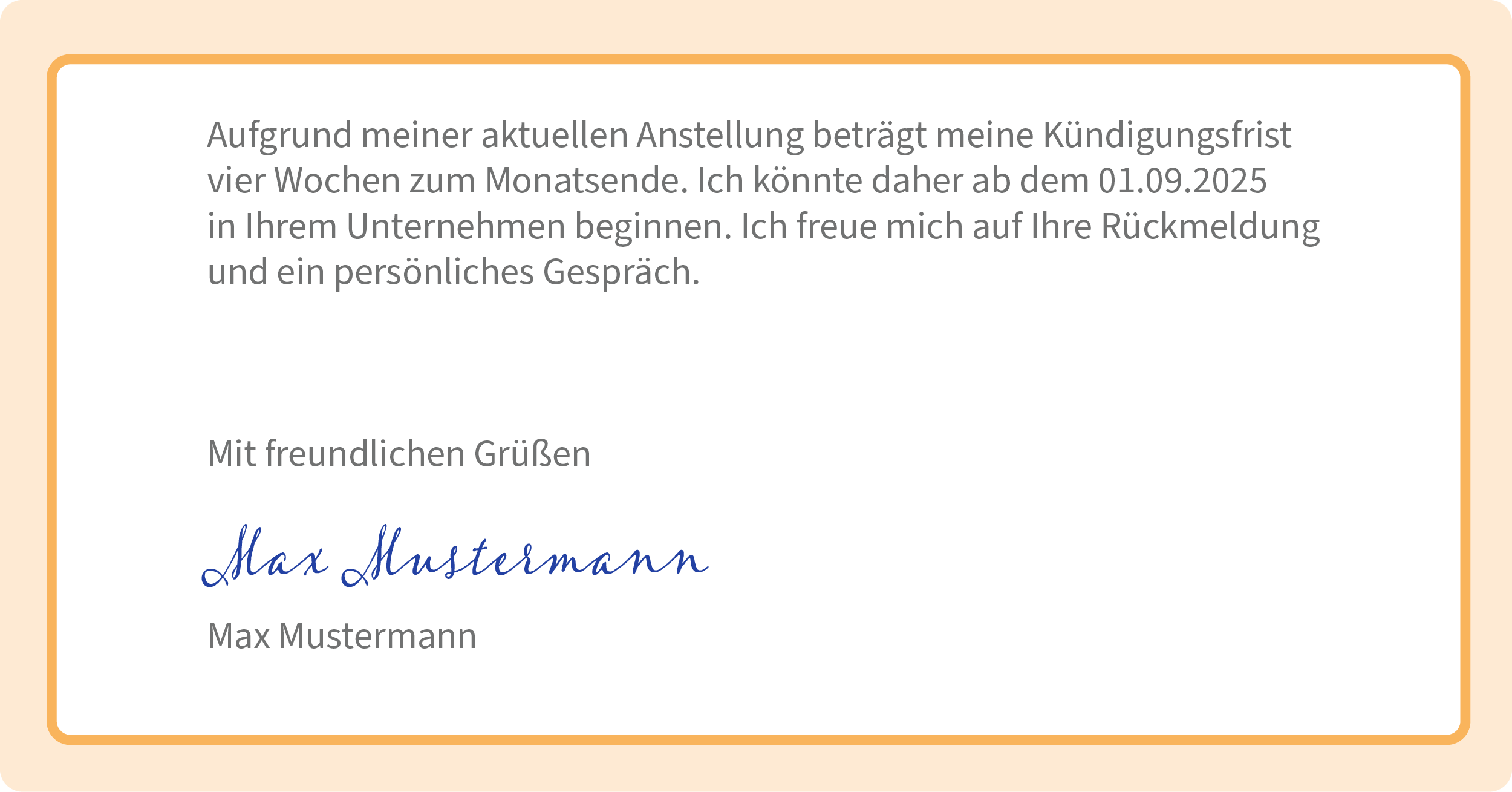 - „Aufgrund meiner aktuellen Anstellung beträgt meine Kündigungsfrist vier Wochen zum Monatsende. Ich könnte daher ab dem [Datum] in Ihrem Unternehmen beginnen. Ich freue mich auf Ihre Rückmeldung und ein persönliches Gespräch.“