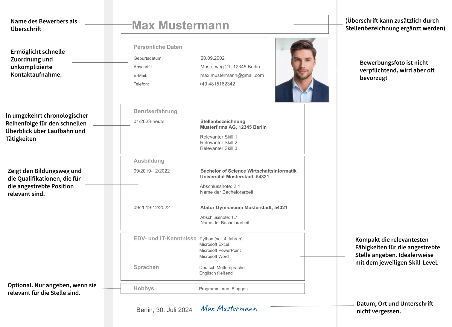 - Datum und Unterschrift: Am Ende des Lebenslaufs steht das Datum der Erstellung sowie die Unterschrift des Bewerbers.